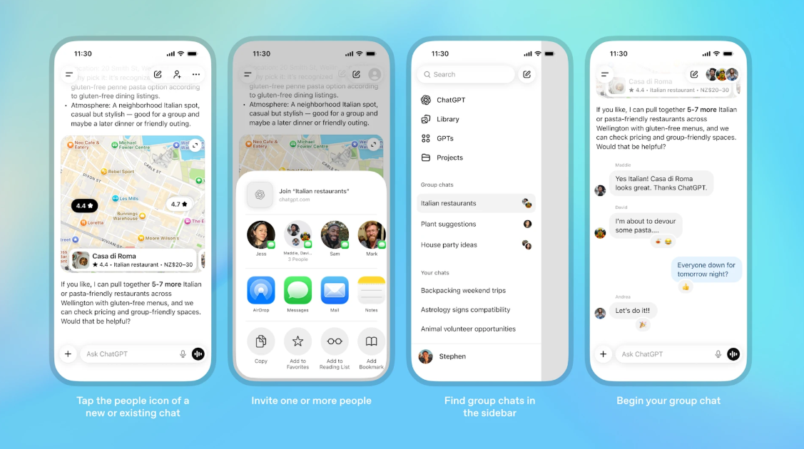 ChatGPT users (including Team, Plus, and Free) can access this feature on web and mobile platforms. Starting a group chat is simple. Users tap the people icon and add participants directly. They can also share a link to begin collaborating.