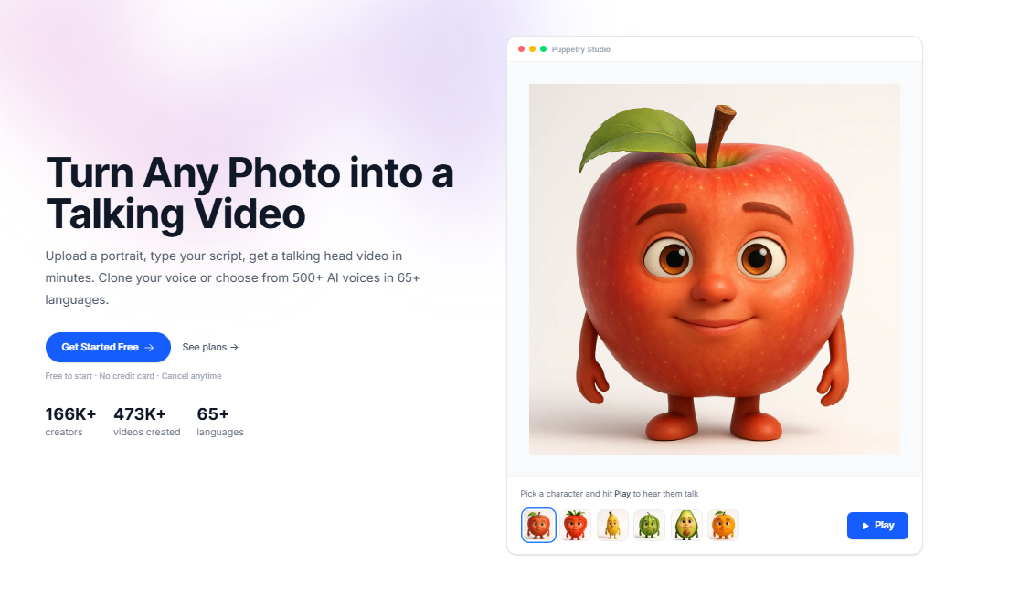 In 2026, no AI talking head video maker does all three better for everyday digital content creators than Puppetry. Not only does it allow you to use your own photos and images, but it also shares over 500 voices you can apply to your creations. What’s more, it bundles its voice cloning (requiring only a 30-second sample) feature with a 65+ language library at a friendly price point.