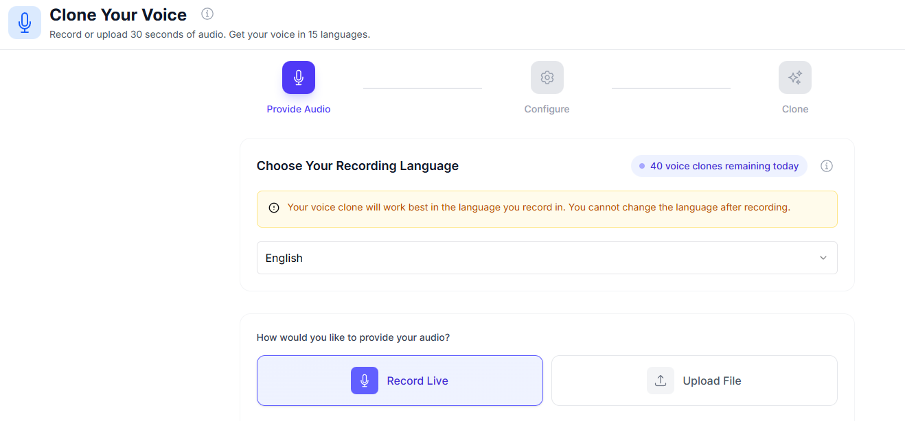 Remember: Your voice clone will work best in the recorded language, and you’ll not be able to change the language after recording.