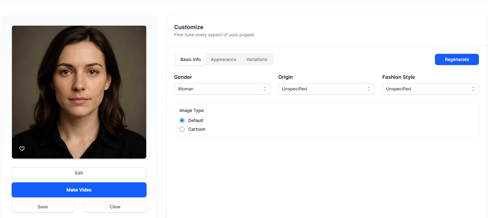 This platform is not only for voice-to-voice conversion and AI face animation but also for creating and customizing puppets based on visual style, gender, and other variations/design details.
