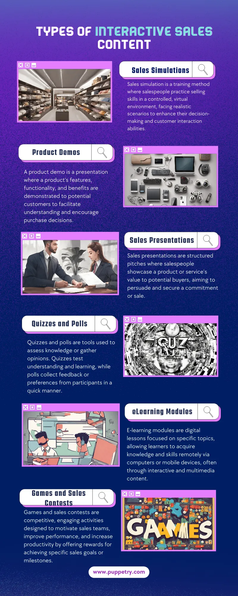Although interactive sales content can number in the hundreds, the following are quite common.